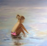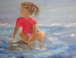 2013meisje zittend op het strand in roserood t shirt op warme zomerdag