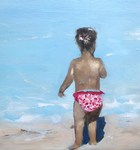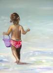 2013Meisje in zwembroek spelend aan zee met emmertje .